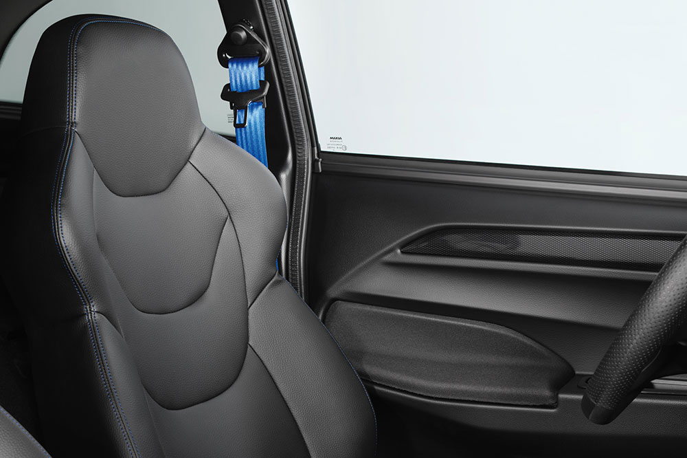 Ablagefach in Türen & Mittelkonsole, Armaturenbrett in moderner Automobil-Spritzgusstechnik, Handschuhfach mit Münz- und Getränkehalter, Dachhimmel in Stoff, Fußmatten schwarz mit Stickereien und blau gesäumt, Gepäcknetz im Kofferraum, herausnehmbar, Gepäckraumabdeckung und Gepäckstopp, Haltegriff Fahrer- und Beifahrerseite, Innenbeleuchtung LED mit Zeitverzögerung beim Ausschalten, Kofferraumverkleidung in Stoff, Luftausströmer einstell- und regulierbar, mittig, Luftausströmer einstell- und regulierbar, rechts und links, Mittelkonsole mit Getränke- und Becherhalterung, Rückspiegel mit Abblendfunktion, Sicherheitsgurte Automatik, Schalldämmung Fahrgastzelle Stufe 2, Schalldämmung Motorraum Stufe 3, Sitze in Sportausführung mit integrierten Kopfstützen in Kunstleder schwarz und mit blauer Steppnaht, Sitz Fahrerseite in Längsrichtung einstellbar, Sitze Fahrer und Beifahrer Rückenlehne einstellbar, Sitzgestell Verkleidung seitlich, Sonnenblende mit Schminkspiegel Fahrer und Beifahrer, Trennwand Fahrgastzelle / Kofferraum