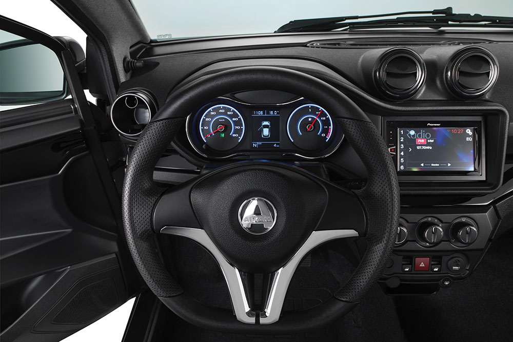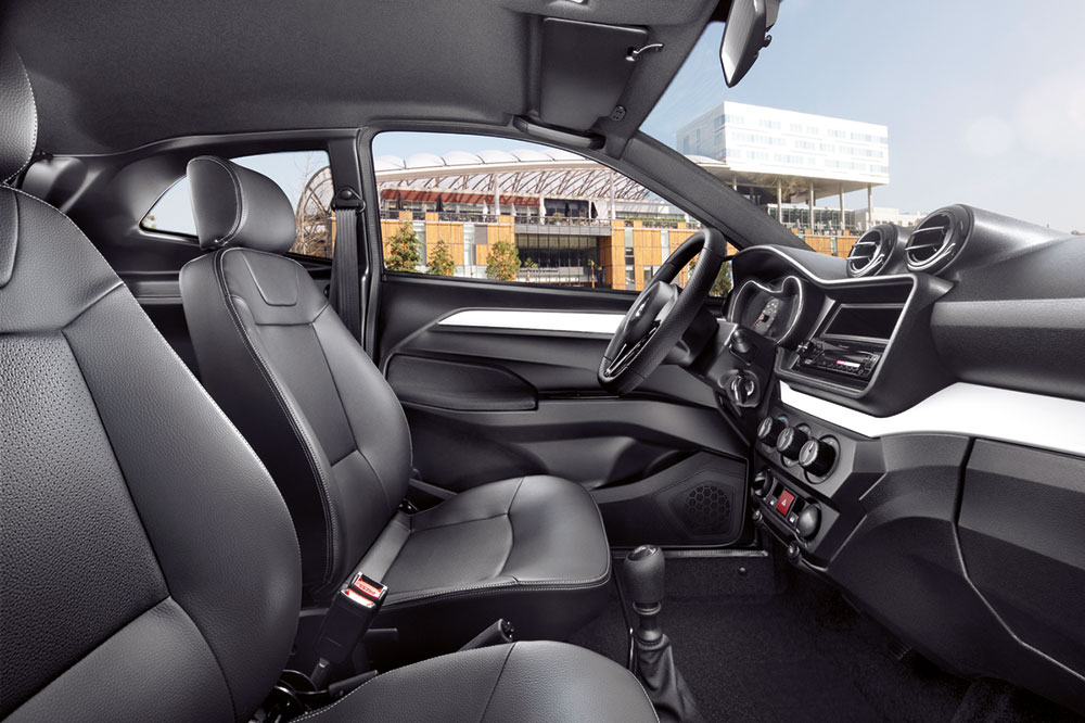Ablagefach in Türen und Mittelkonsole, Armaturenbrett in moderner Automobil-Spritzgusstechnik, Handschuhfach mit Münz- und Getränkehalter, Dachhimmel in Stoff, Gepäckraumabdeckung und Gepäckstopp, Haltegriff Fahrer- und Beifahrerseite, Innenbeleuchtung LED mit Zeitverzögerung beim Ausschalten, Kofferraum- und Radlaufverkleidung in Stoff, Kopfstützen in Höhe einstellbar, Luftausströmer einstell- und regulierbar, mittig, Rückspiegel mit Abblendfunktion, Sicherheitsgurte Automatik, Schalldämmung Fahrgastzelle Stufe 1, Schalldämmung Motorraum Stufe 2, Sitze in Kunstleder schwarz, Sitz Fahrerseite in Längsrichtung einstellbar, Sitze Fahrer und Beifahrer Rückenlehne einstellbar, Sitzgestell Verkleidung seitlich, Sonnenblende mit Schminkspiegel Fahrer und Beifahrer, Steckdose 12 V (bei Tablet Radio ersetzt durch USB Anschluss)