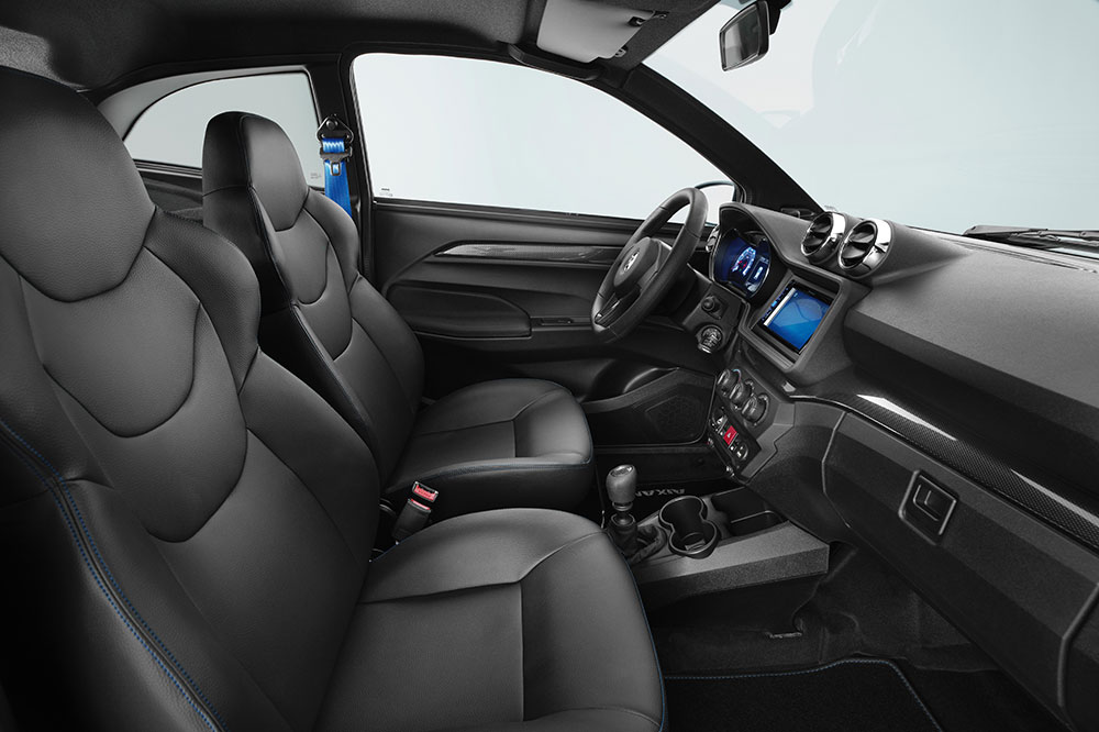Ablagefach in Türen und Mittelkonsole, Armaturenbrett in moderner Automobil-Spritzgusstechnik, Handschuhfach mit Münz- und Getränkehalter, Dachhimmel in Stoff, Fußmatten schwarz mit Stickereien und blau gesäumt, Gepäcknetz im Kofferraum, herausnehmbar, Gepäckraumabdeckung und Gepäckstopp, Haltegriff Fahrer- und Beifahrerseite, Innenbeleuchtung LED mit Zeitverzögerung beim Ausschalten, Kofferraumverkleidung in Stoff, Luftausströmer einstell- und regulierbar, mittig, Luftausströmer einstell- und regulierbar, rechts und links, Mittelkonsole mit Getränke- und Becherhalterung, Rückspiegel mit Abblendfunktion, Sicherheitsgurte Automatik, Schalldämmung Fahrgastzelle Stufe 2, Schalldämmung Motorraum Stufe 3, Sitze in Sportausführung mit integrierten Kopfstützen in Kunstleder schwarz und mit blauer Steppnaht, Sitz Fahrerseite in Längsrichtung einstellbar, Sitze Fahrer und Beifahrer Rückenlehne einstellbar, Sitzgestell Verkleidung seitlich, Sonnenblende mit Schminkspiegel Fahrer und Beifahrer, Trennwand Fahrgastzelle / Kofferraum